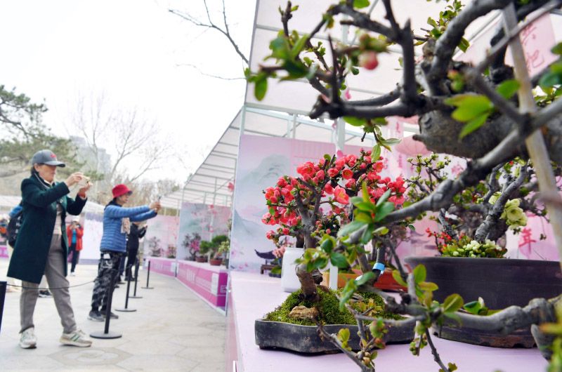 游客欣赏精品海棠盆景。陶然亭公园共有30余种3000余株地栽海棠,文化节期间,还将展出20余种500余盆海棠精品盆景。