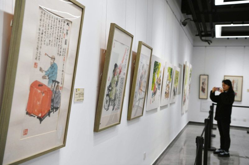 游客欣赏“京腔京味自多情——马海方国画展”。