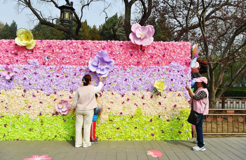 游客在花墙打卡。公园沿东门内广场、东码头对面广场、陶然牌楼、中心广场,设置海棠映壁、花影摇曳、春醉陶然、精品盆景区4处景观节点,串联精品赏花线路景观,并打造“梦幻棠影 夜游陶然”主题夜间景观带。