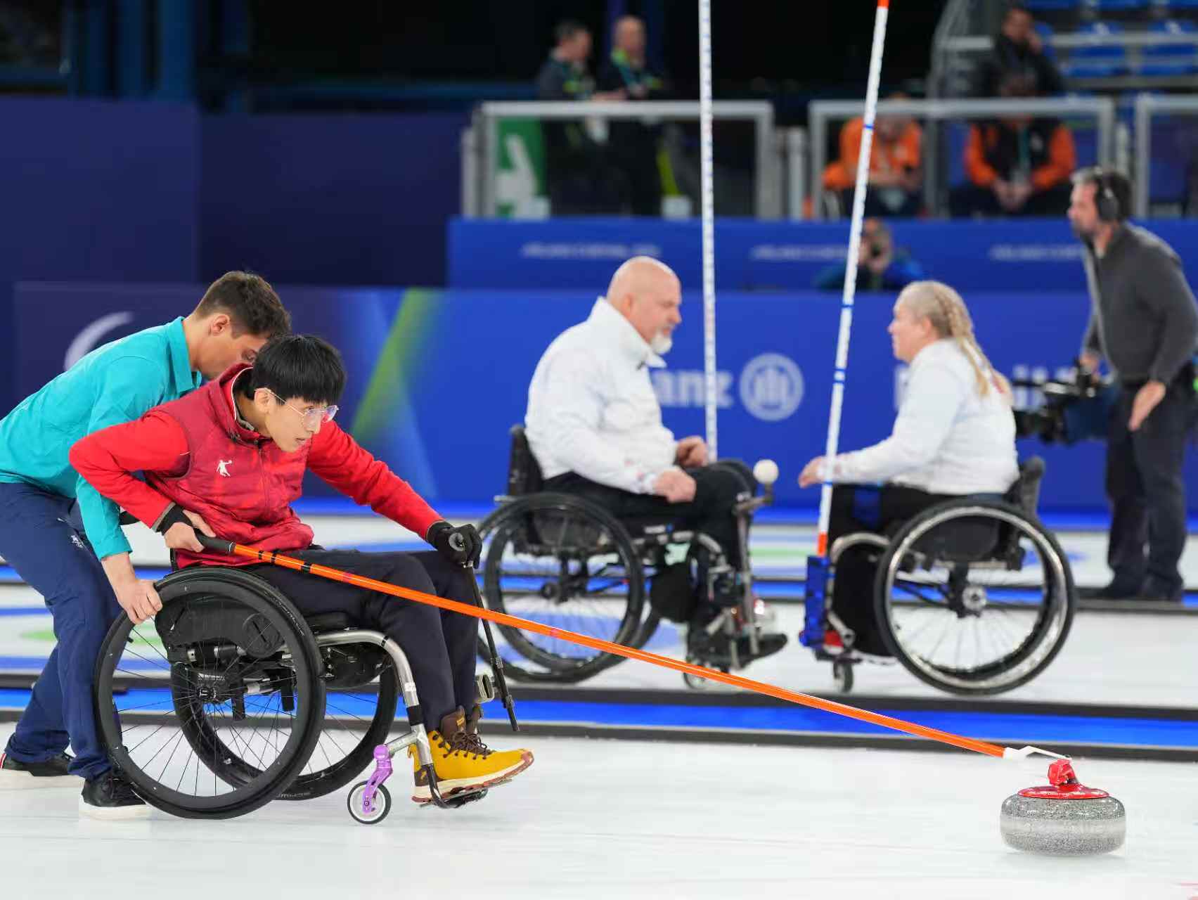 “那是我第一次在那么多人面前推冰壶,心跳得特别快。”4年后,杨金桥站上了米兰冬残奥会赛场,搭档王蒙出战混双项目。王蒙年长杨金桥13岁,身上也写满了传奇。她最早是一名残疾人乒乓球运动员,之后改练了轮椅冰壶。2018年平昌冬残奥会,王蒙是轮椅冰壶团体冠军的一员,那也是中国体育代表团冬残奥会首枚金牌。落选北京冬残奥会后,王蒙又从四人冰壶转项到了混双项目,继续冲击冬残奥会最高领奖台。