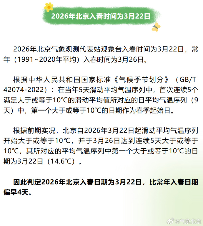 因此判定2026年北京入春日期为3月22日,比常年入春日期偏早4天。