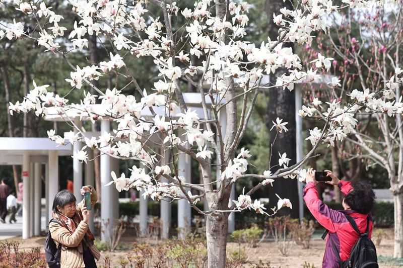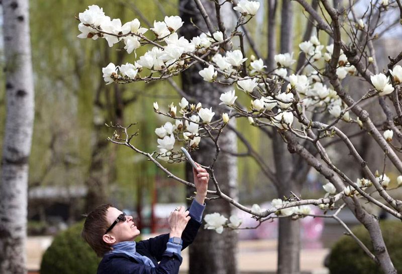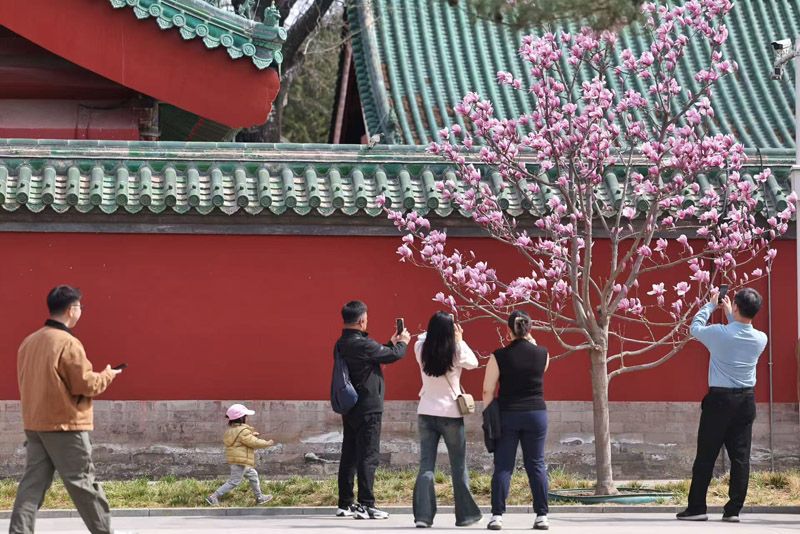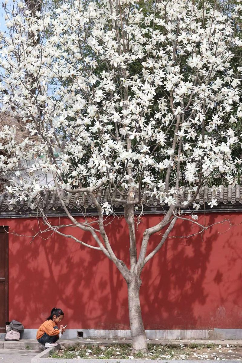 3月27日,日坛公园,玉兰正值盛花期,洁白、淡紫的花朵映衬着红墙绿瓦,显得格外清雅。枝头繁花芬芳馥郁,为春日平添一抹独特韵味。盛放的玉兰不仅吸引了众多市民驻足拍照,也引得不少外国友人入园赏花留影。
