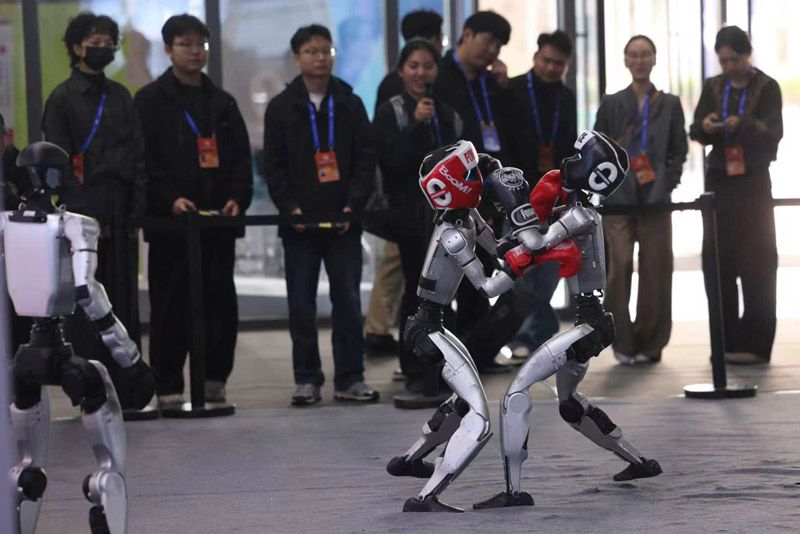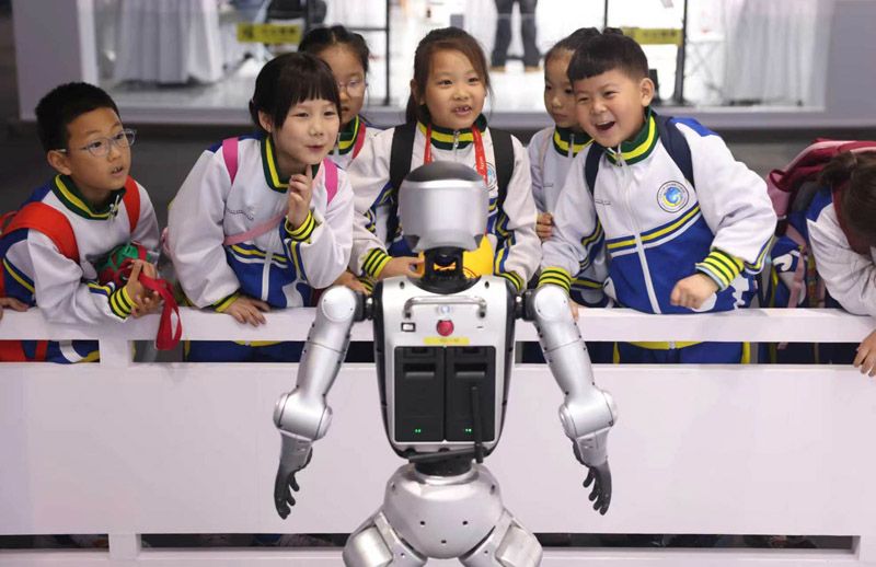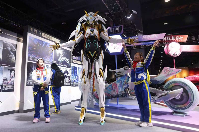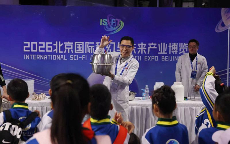 3月27日,2026北京国际科幻与未来产业博览会在北京石景山首钢园首钢国际会展中心开幕,作为2026中国科幻大会十周年同期活动,本届博览会以“领航未来”为主题,围绕“未来共生之旅”串联四大核心展区,实现硬核科技展示与全民趣味体验深度融合。图为参观博览会的小观众被MECHASUN格斗汽车机甲所吸引。