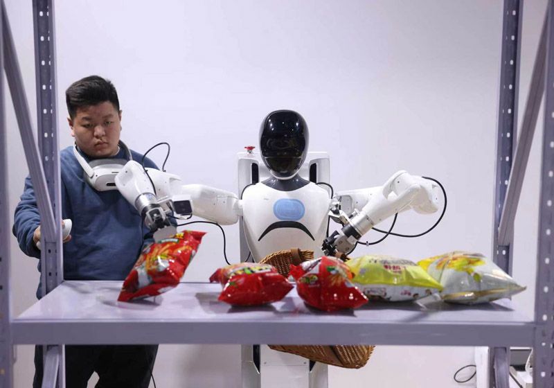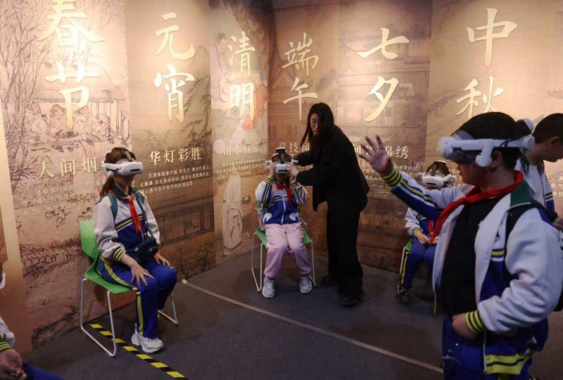 小观众头戴MR设备,体验数字美育课程《中国古画里的传统节日》。
