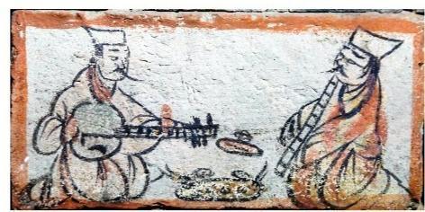 甘肃嘉峪关“魏晋六号”墓室砖壁画,奏乐图。