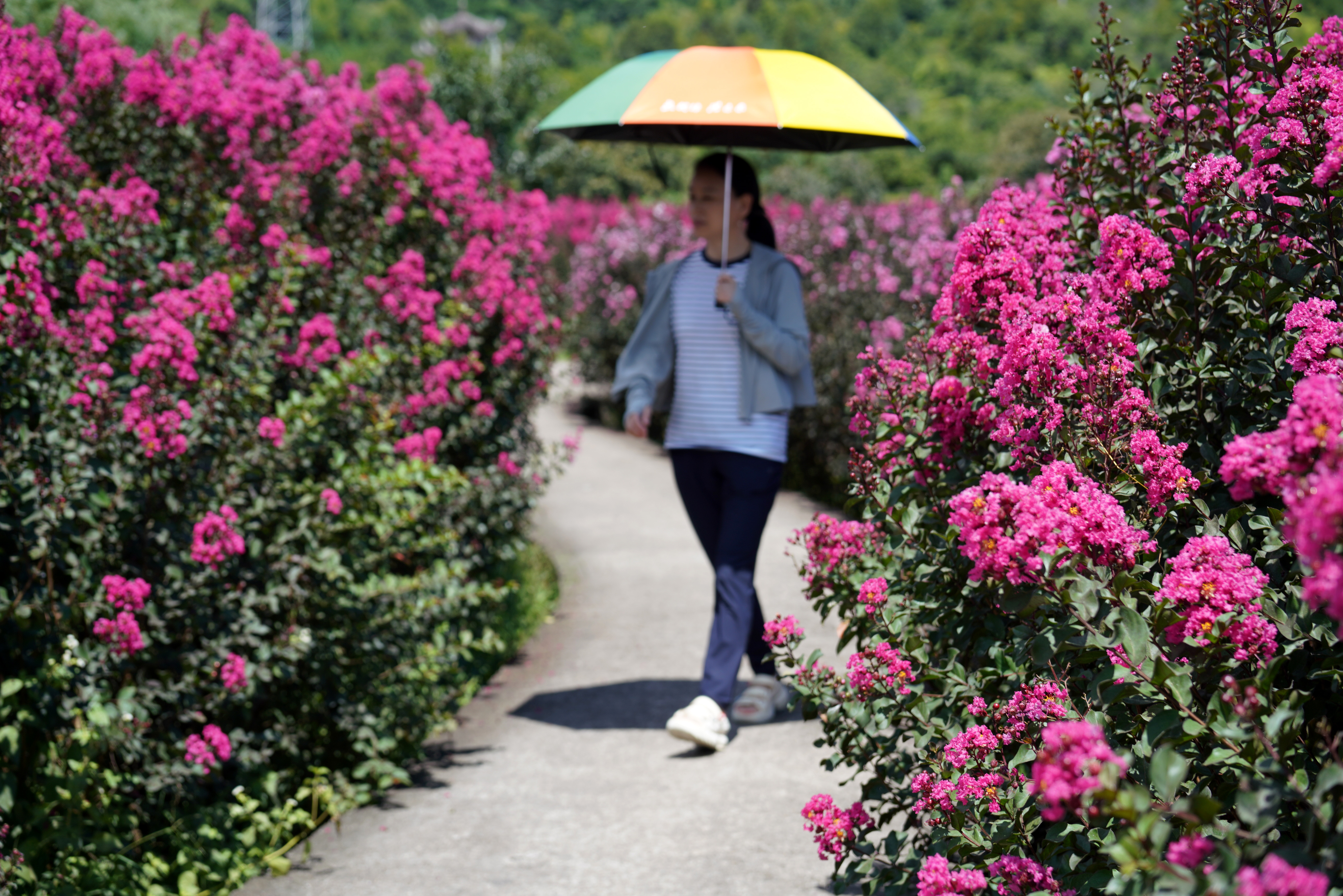 游客在浙江省永嘉县岩头镇芙蓉村紫薇花园赏花游玩。紫薇属于先叶后花品种。资料图/IC photo