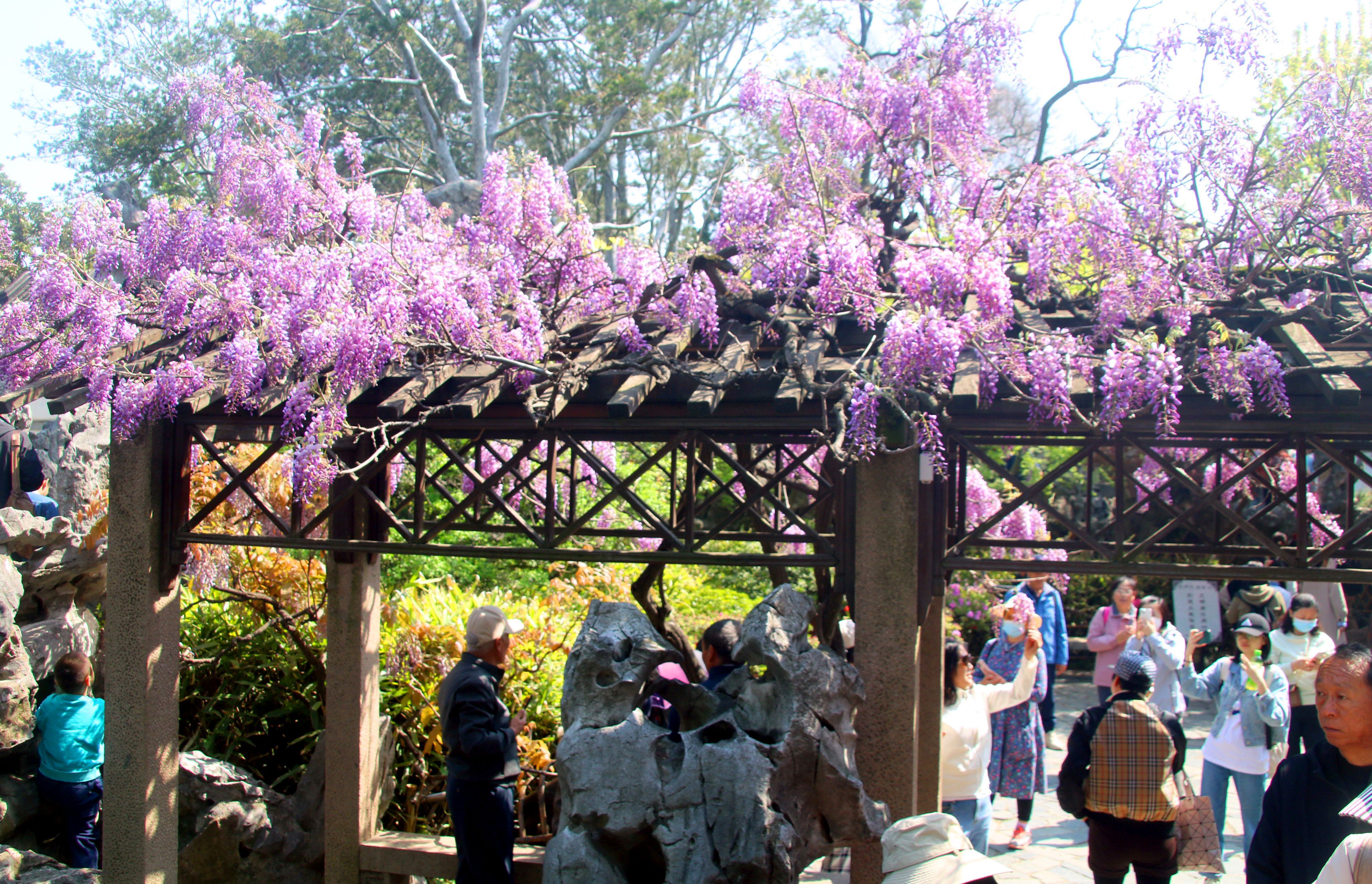 游客在苏州古典园林狮子林盛开的紫藤花旁赏花游览。紫藤属于先叶后花品种。资料图/IC photo