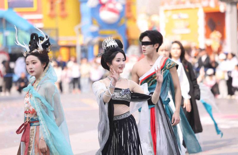 园区赛博敦煌、童话世界、野人部落等主题世界的NPC(非玩家角色)演员集体走秀。