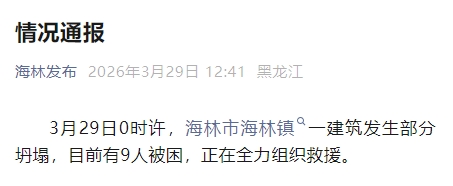 新京报讯 据海林发布消息,3月29日0时许,海林市海林镇一建筑发生部分坍塌,目前有9人被困,正在全力组织救援。