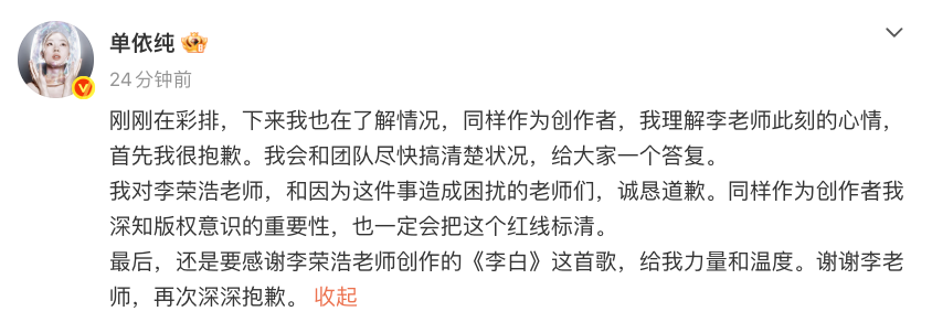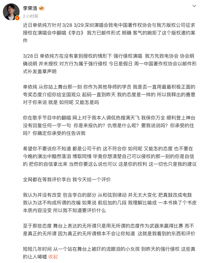 3月29日,歌手李荣浩在社交平台发布长文,公开控诉歌手单依纯在3月28日和3月29日的深圳演唱会上,未经授权翻唱其代表作《李白》,构成明确版权侵权行为。两个小时后,单依纯也在社交平台做出简单回应:“我理解李老师此刻的心情,首先我很抱歉。我会和团队尽快搞清楚状况,给大家一个答复”,并表示“深知版权意识的重要性,也一定会把这个红线标清”。