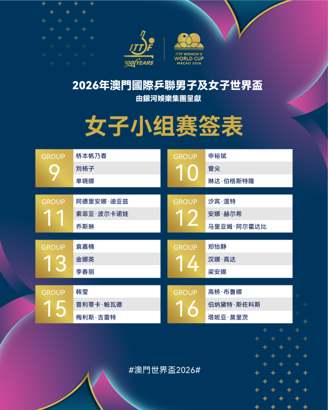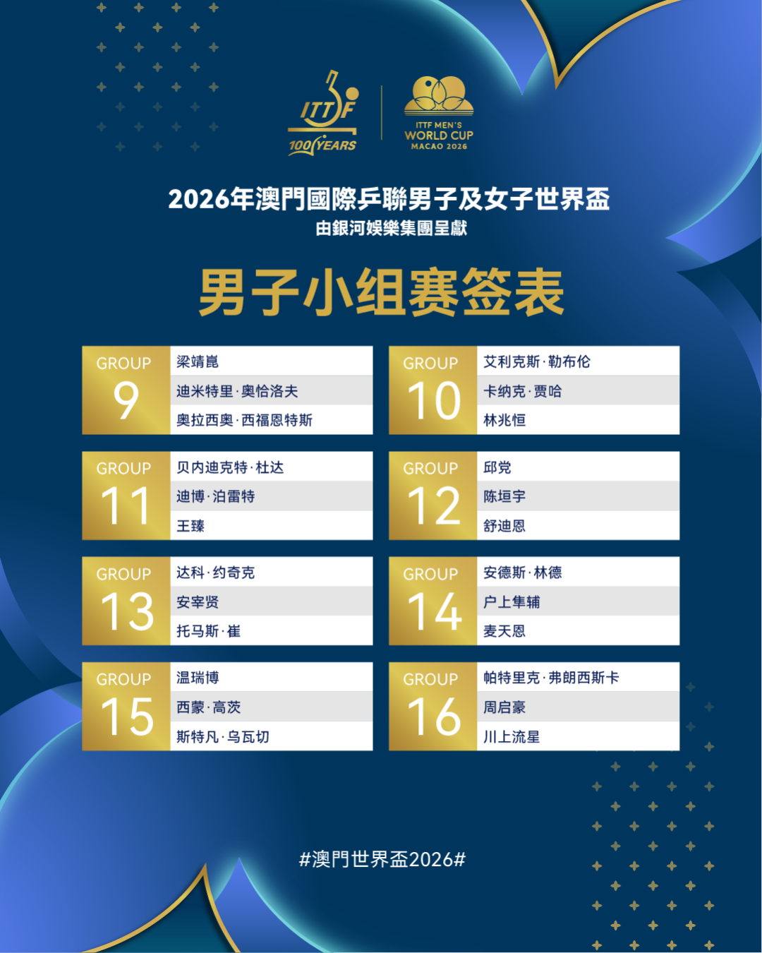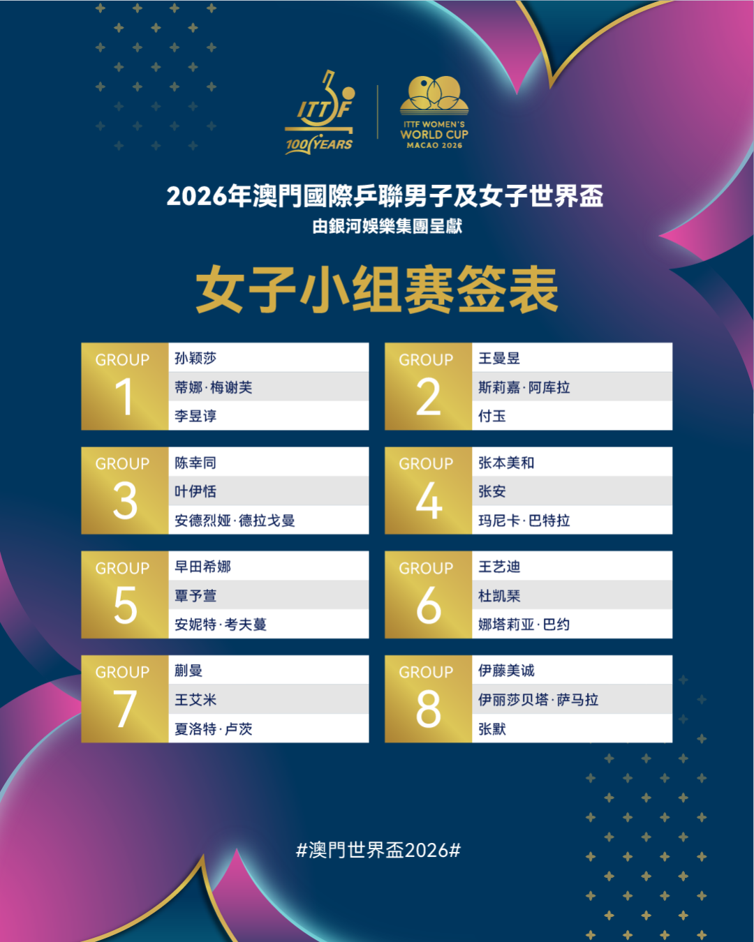 据央视体育消息,2026年澳门国际乒联男子及女子世界杯将于3月30日至4月5日在中国澳门银河综艺馆举行。届时,来自五大洲的男、女各48位顶尖运动员们将展开激烈角逐,本次赛事小组赛签表已出炉。