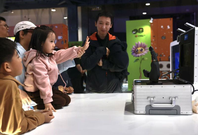 小朋友与感知机器手“交流”。