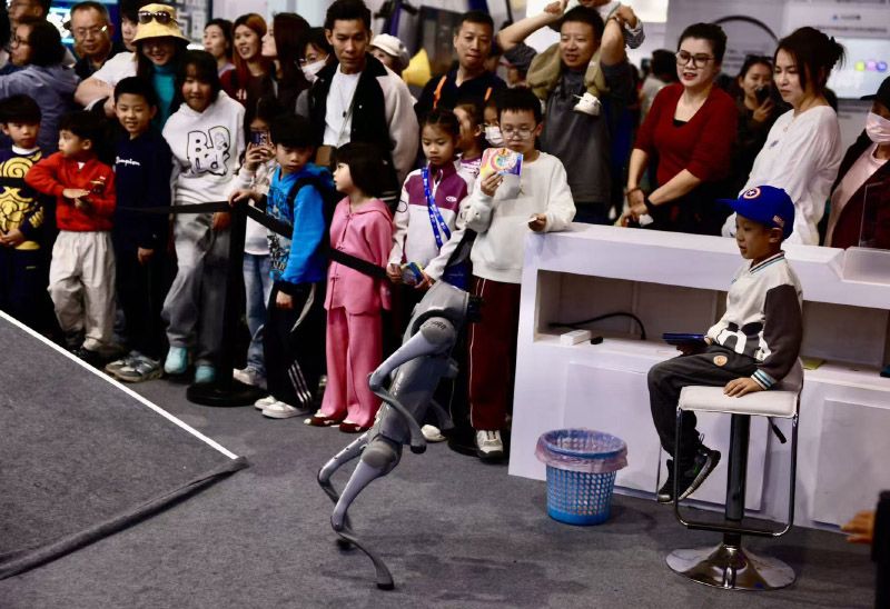 3月29日,2026中国科幻大会在北京首钢园圆满落幕。琳琅满目的前沿机器人产品与充满好奇的小朋友们构成了现场最动人的画面,孩子们在与科技的亲密接触中,尽情探索、欢笑互动,充分感受着科幻与人工智能带来的独特魅力。图为宇树科技机器狗与孩子互动。