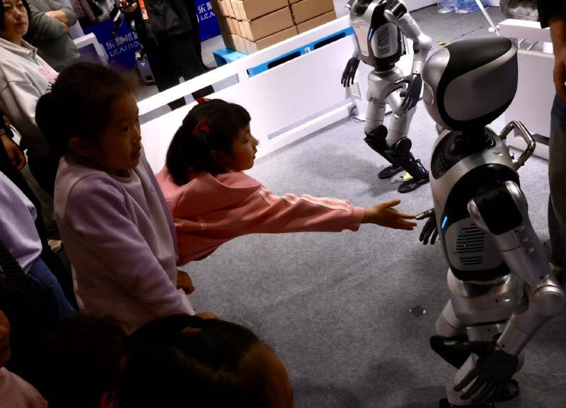 一位小朋友热切地与机器人握手。