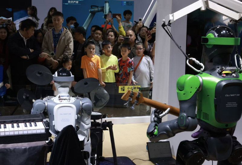 小朋友观看机器人乐队表演。