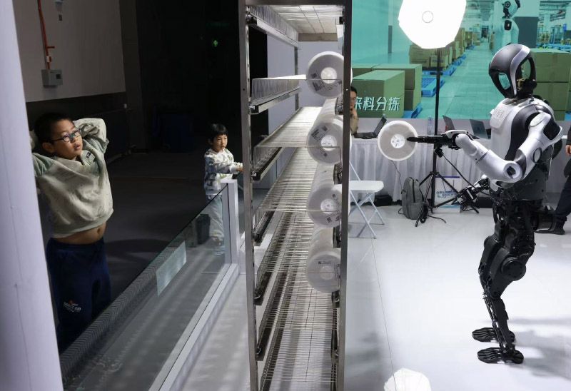 小朋友观摩机器人分拣物品。