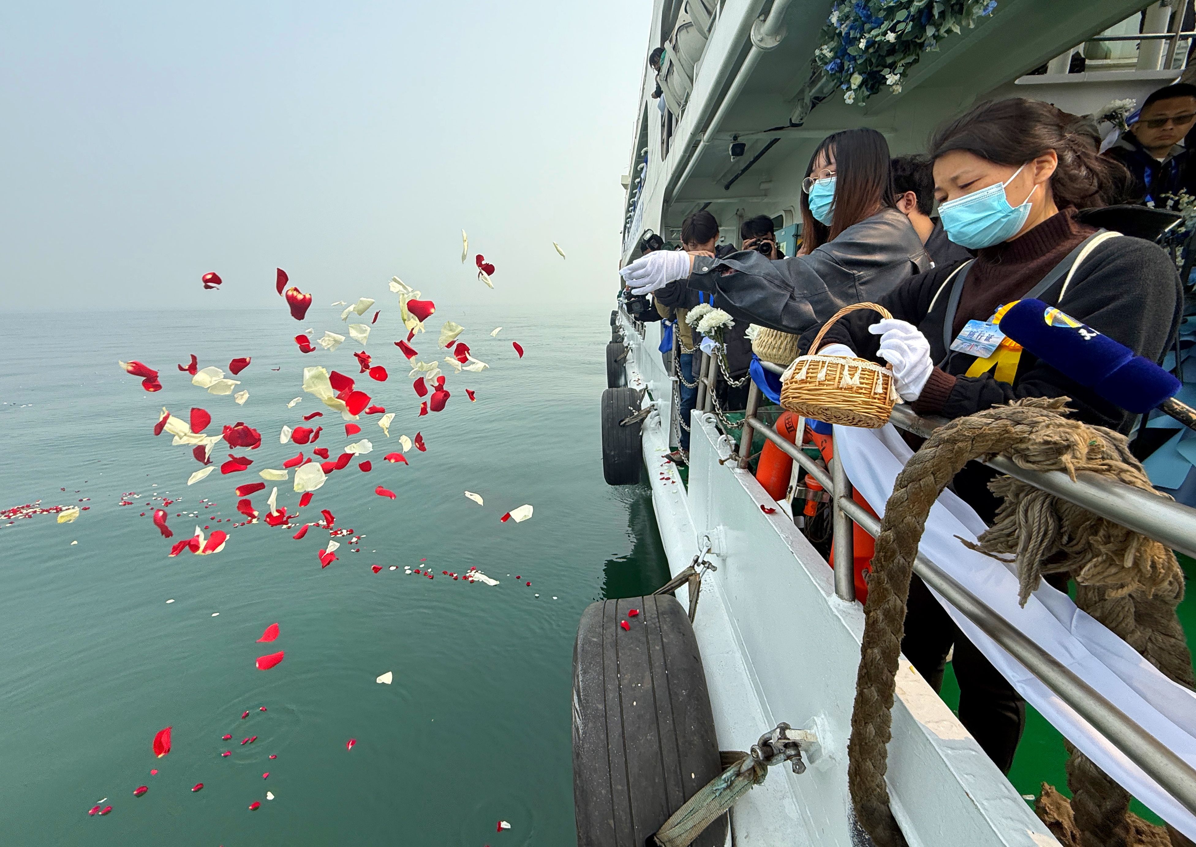 3月29日,2026年京津冀骨灰海葬启航活动在天津渤海湾隆重举行。图为家属代表将花瓣撒入大海。新京报记者 王贵彬 摄