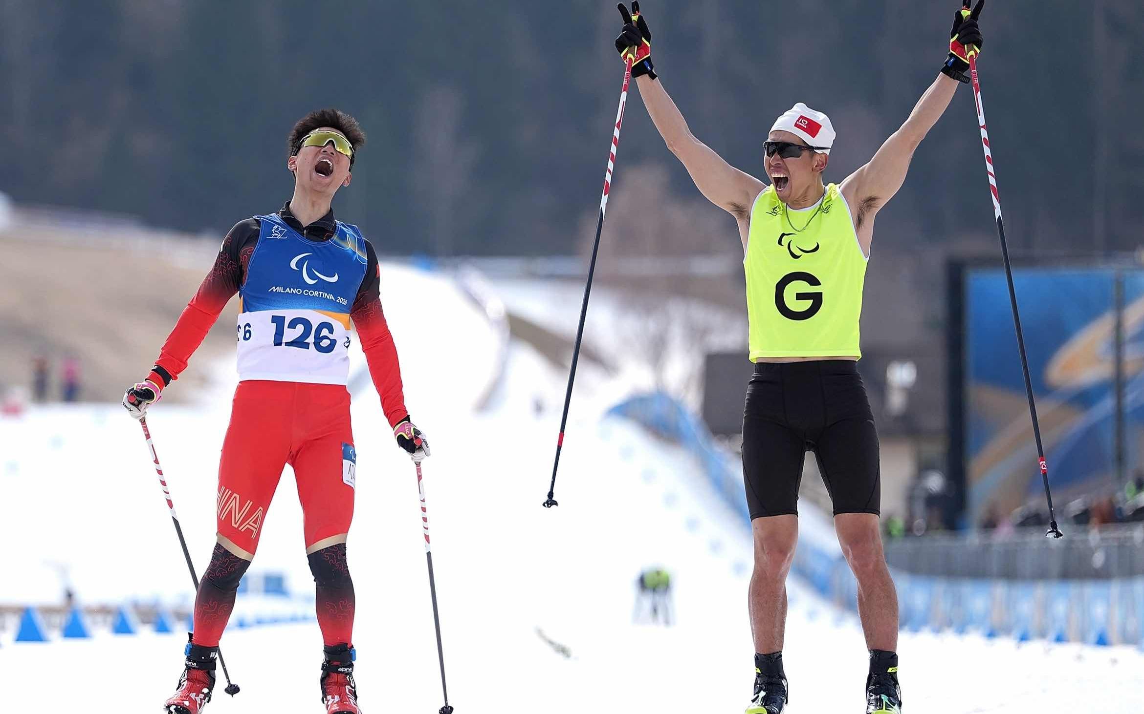 米兰冬残奥会,余爽(左)与领滑员尚金财一起庆祝胜利。受访者供图