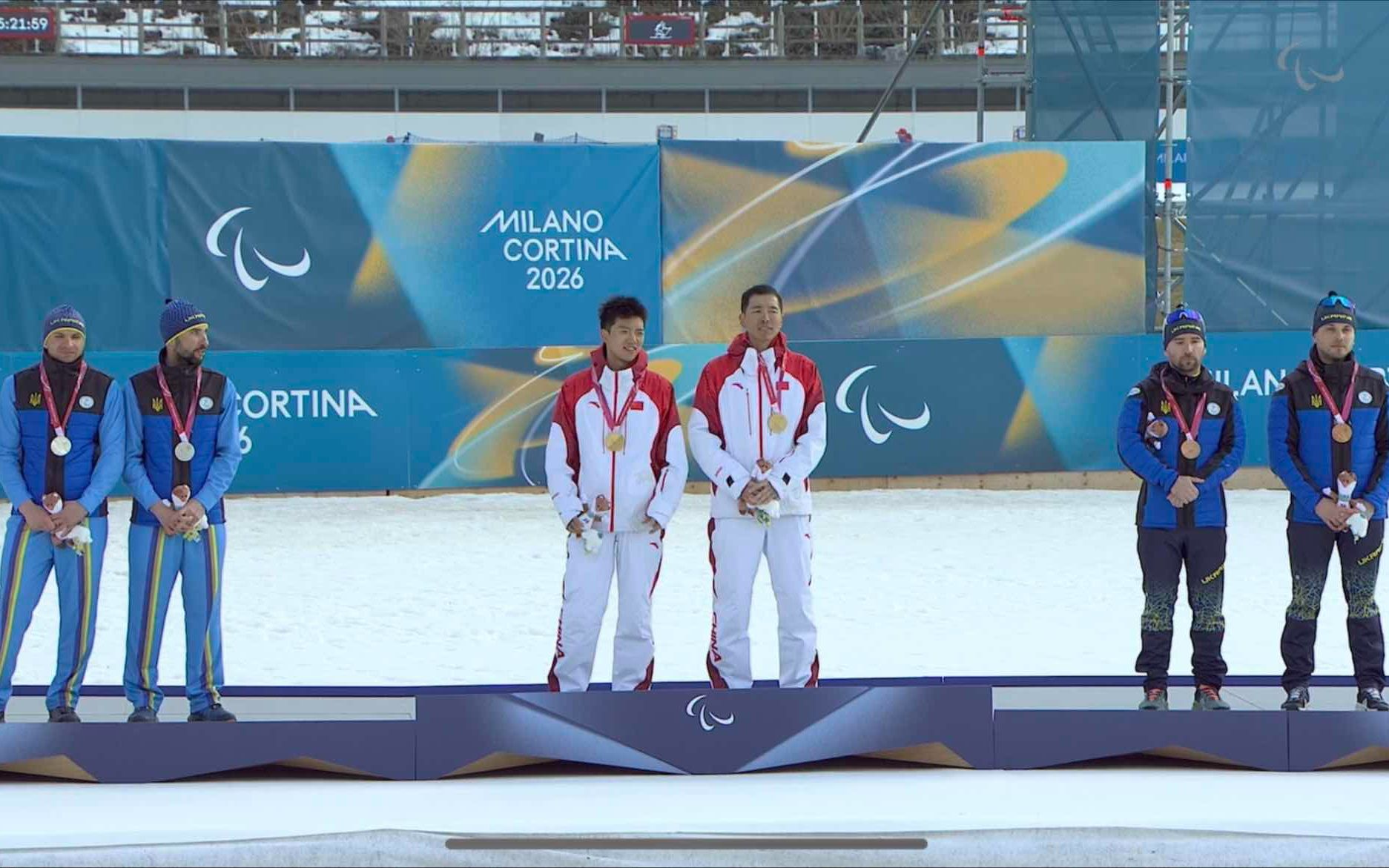 米兰冬残奥会,余爽(左)与领滑员尚金财一起站上最高领奖台。受访者供图