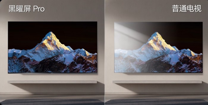 海信小墨E5Q Pro怎么解决这个问题?答案是直接在屏幕材质上放大招。百吋版本搭载了专属的黑曜屏Pro。屏幕表面有一层防眩光层和纳米级低反层,屏幕反射率低至2.6%。不管是白天外头的大太阳,还是晚上客厅耀眼的水晶吊灯,照在屏幕上都不会产生刺眼的倒影,画面依然纯净。