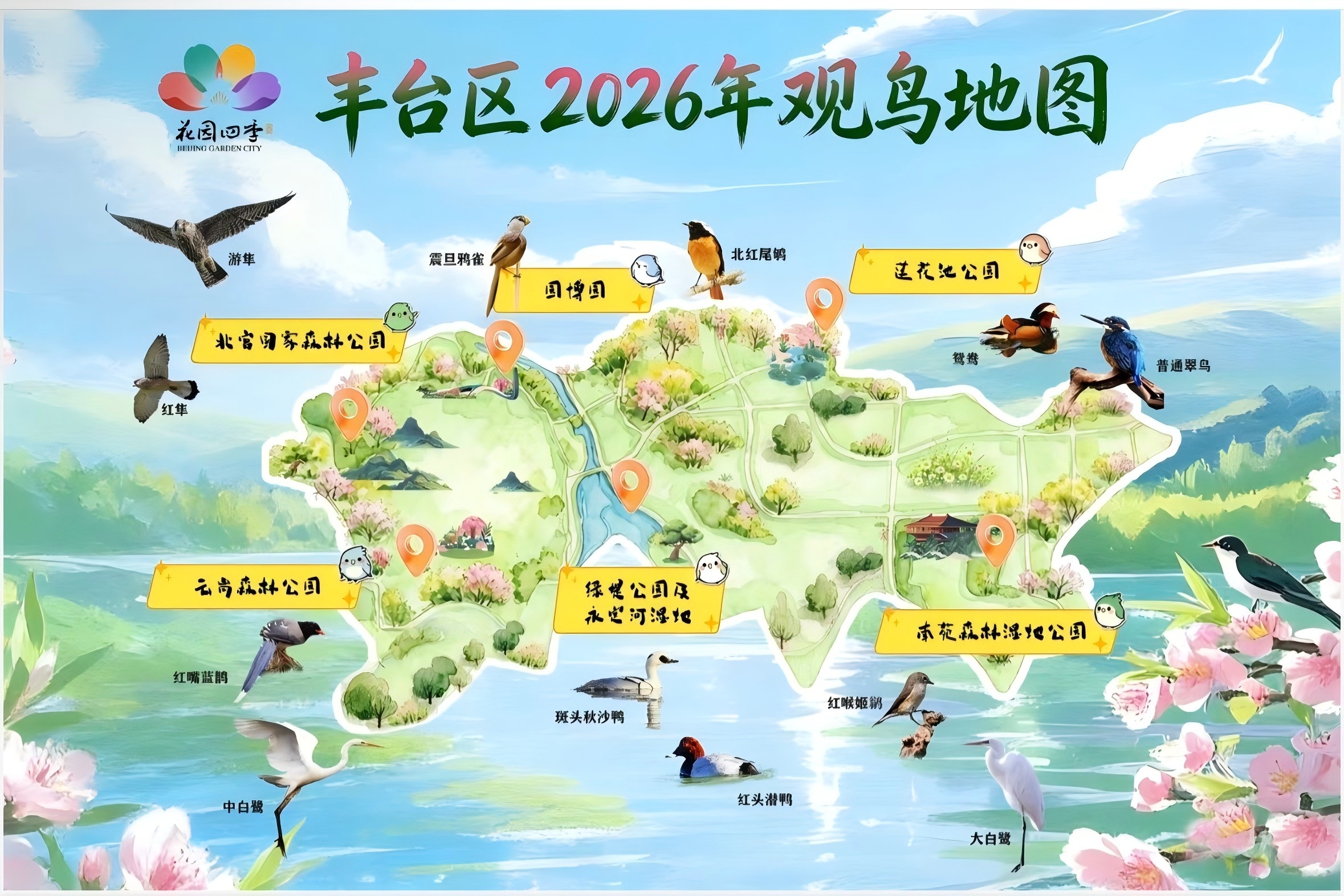 在打造全域赏花景观的同时,近年来丰台区持续深耕生物多样性保护。2026年,丰台区升级打造“六园和鸣”观鸟走廊,串联南苑森林湿地公园、莲花池公园、北京园博园、北宫国家森林公园、云岗森林公园和绿堤郊野公园六大核心观鸟胜地,让市民在赏花之余,邂逅百鸟齐飞的生态美景。