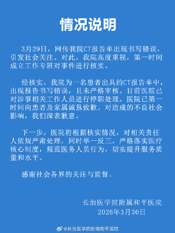 男子CT报告显示子宫正常,长治医学院附属和平医院:涉事工作人员停职