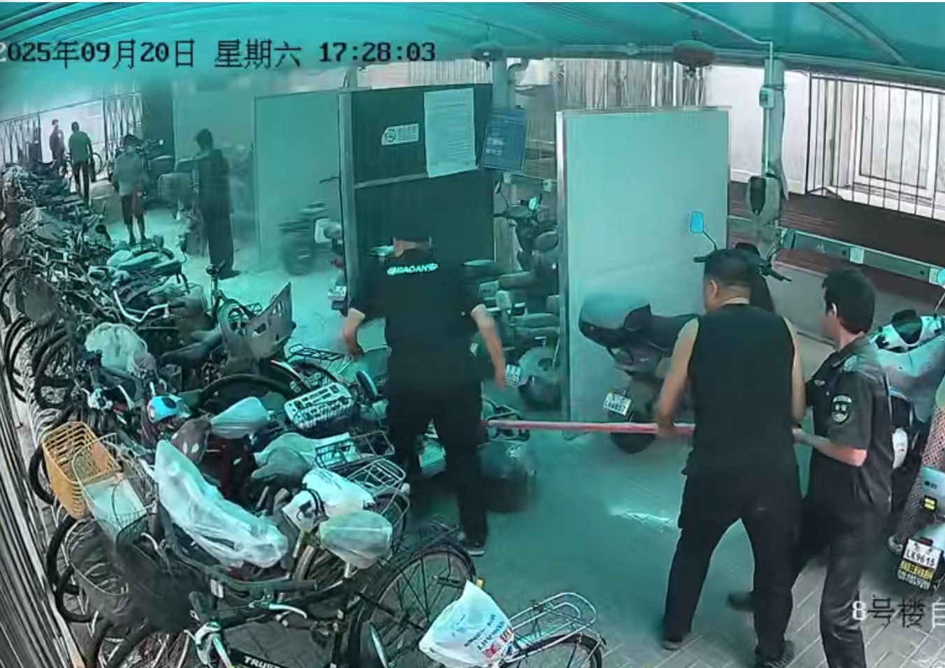 多位热心居民没有丝毫犹豫,迅速拿起附近的灭火器冲向车棚,对准起火车辆进行喷射。有居民第一时间拨通了物业的24小时报修电话,前台接报后立即通知微型消防站队员;而在不远处巡逻的保安,也听到了爆炸声,便迅速前往查看。