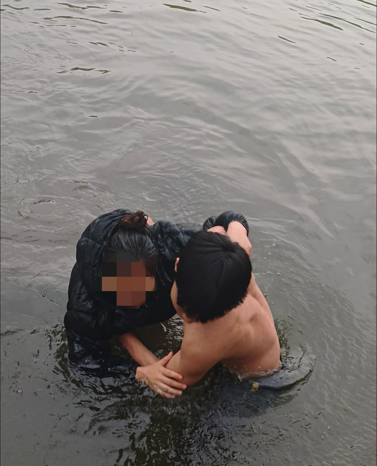 事发现场,孟施成拽着落水女子往岸边靠。受访者供图