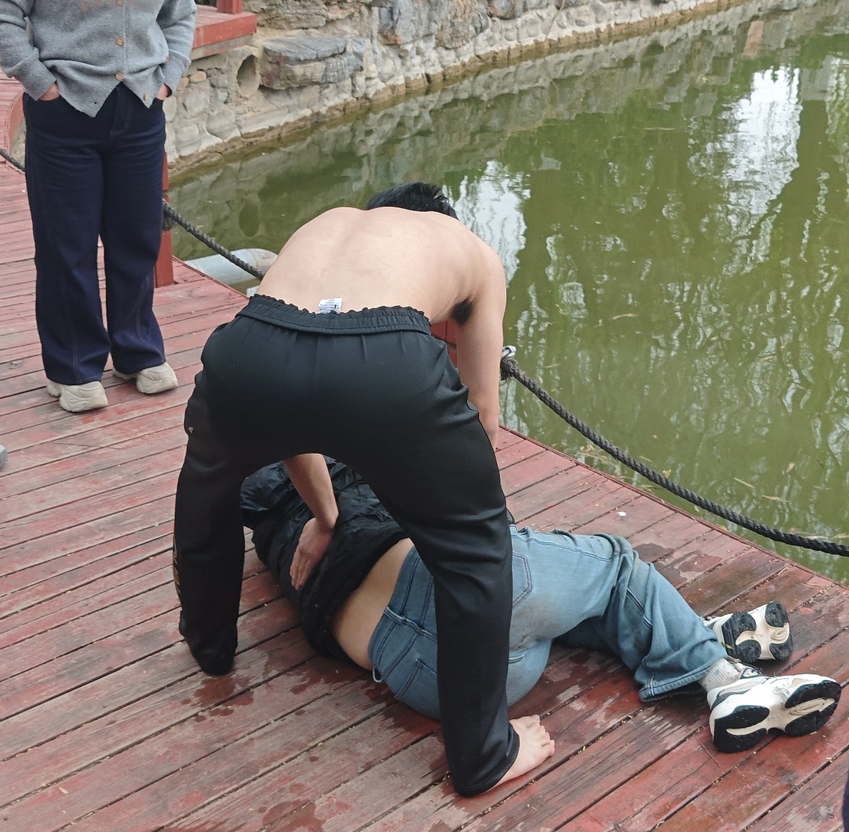 孟施成回忆,3月26日18时许,他和校武术队的一名同学正在虢国公园跑步,途中歇息期间,他听到人工湖处传来“有人落水了”,赶紧和同学跑过去,“看到湖里有一个大姐,状态不对劲,好像喝了很多水。”他让不会游泳的同学赶紧拨打120和110,自己则脱下上衣跳进湖里。