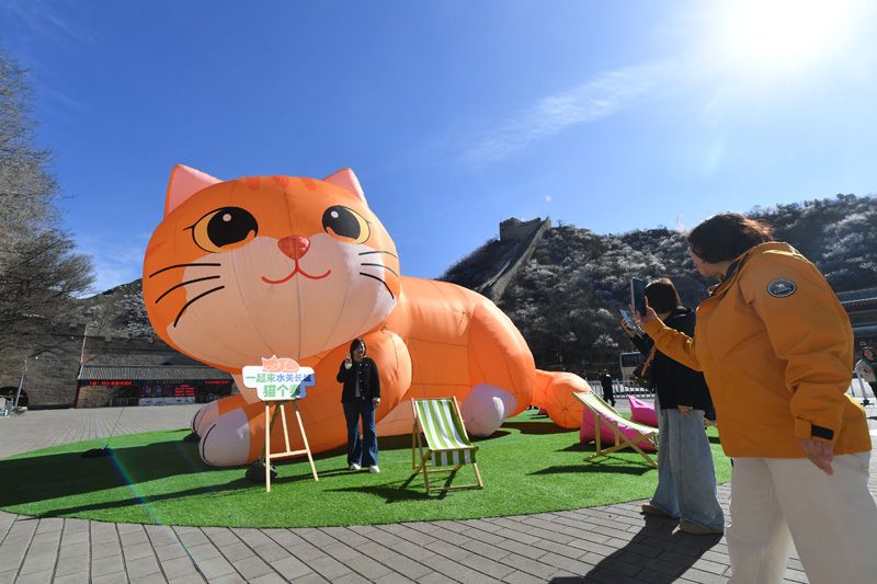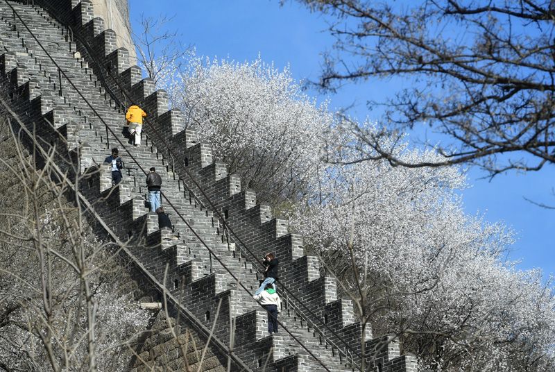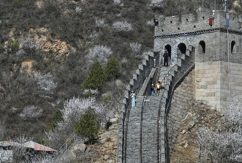 4月1日,游客攀登水关长城。清明假期,延庆玉渡山景区、永宁镇铸造艺术区、四海镇大树与猫民宿、ClubMed Joyview北京延庆度假村等处筹备了丰富的民俗体验活动,让游客在踏青赏春之际,感受传统节日的文化底蕴。