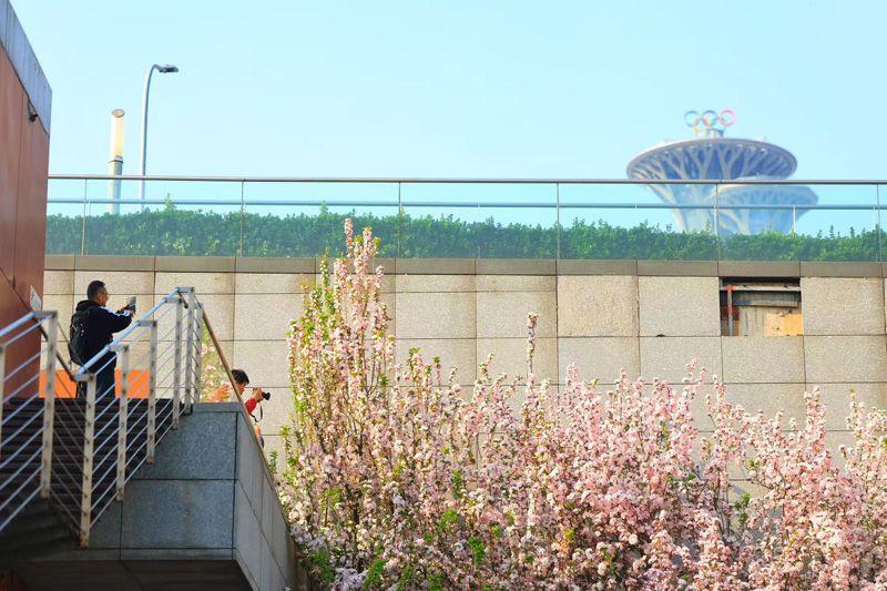 4月1日,奥林匹克公园站B口,海棠繁花竞放,市民在花前拍照。