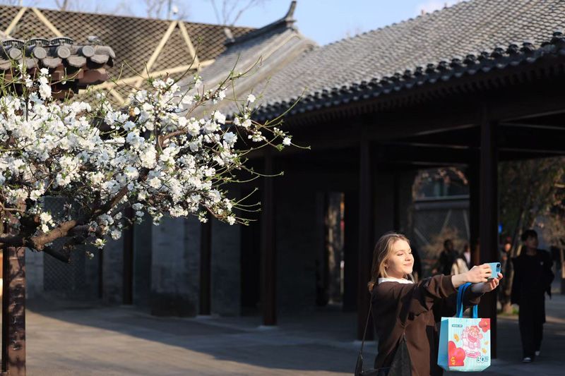 外国友人在盛开的梨花前自拍。