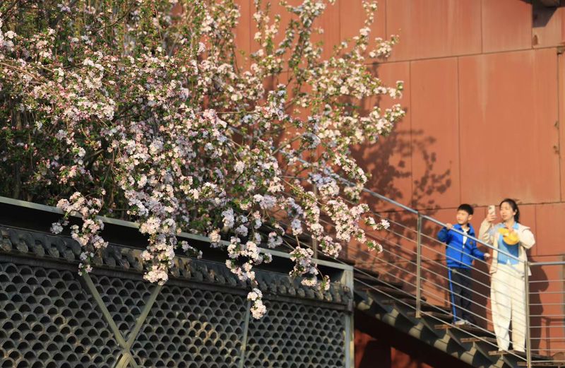 市民驻足欣赏春花。除了海棠,丁香、梨花等也相继开放。