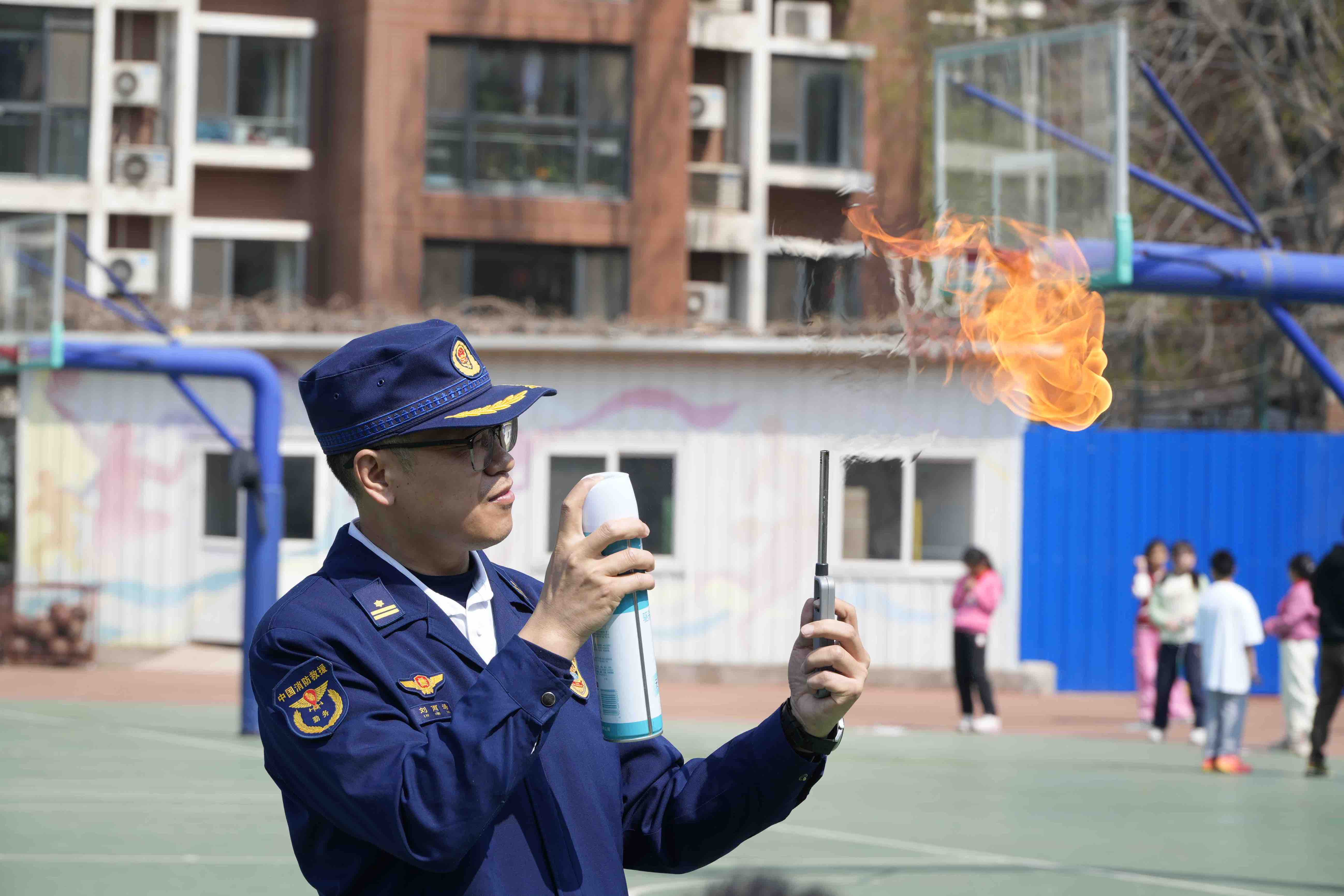 在趣味科学实验环节,消防员演示杀虫剂遇明火后喷射火焰的场景。大兴消防供图