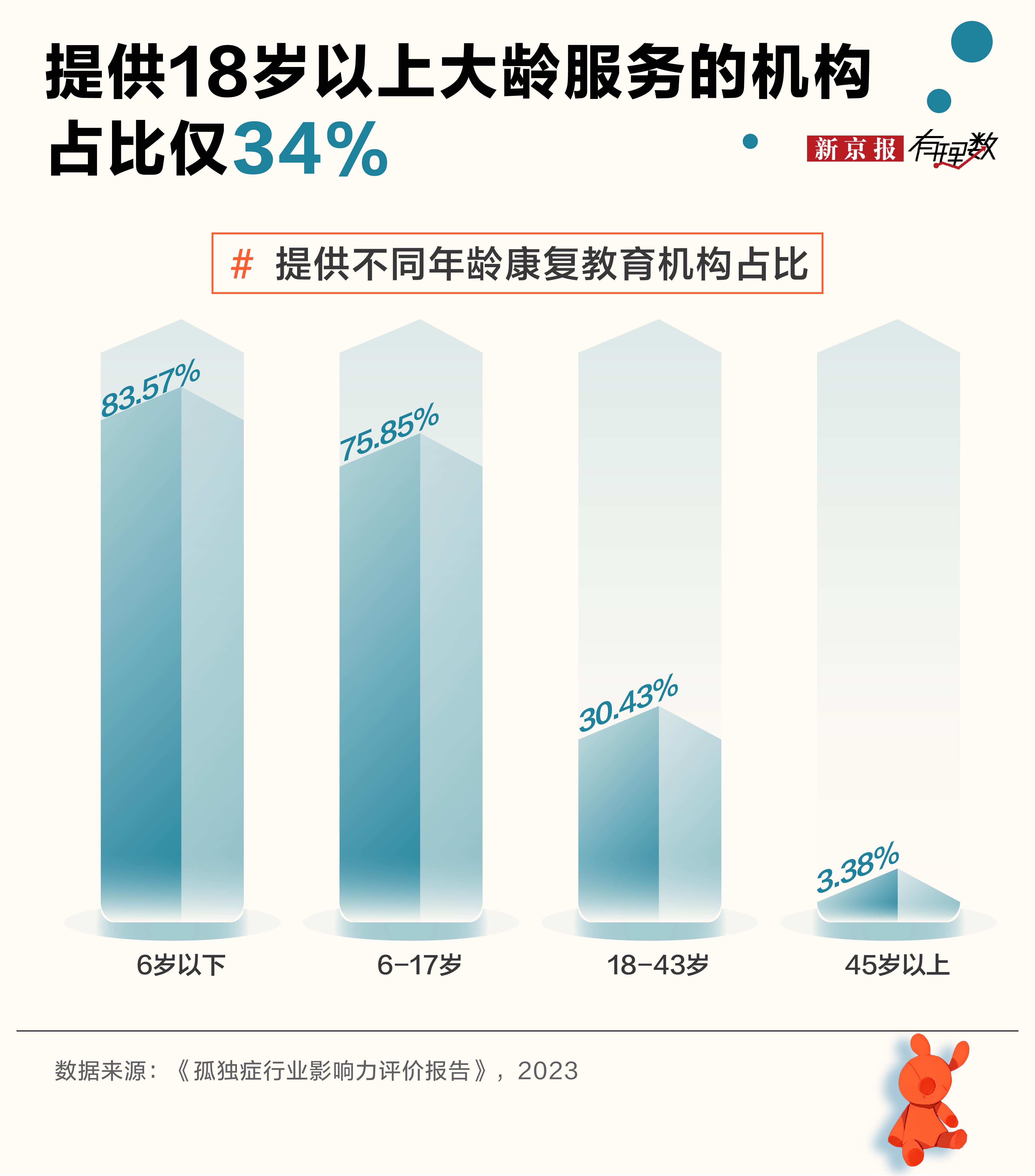 资源分配同样失衡:康复服务高度向0—7岁低龄儿童倾斜,84%的机构主要服务0—6岁患儿,仅34%的机构为18岁以上大龄群体提供支持,远远无法满足现实需求。与此同时,机构总量不足、部分机构缺乏专业资质、师资培训薄弱、收费虚高等问题,也严重制约着康复事业的健康发展。