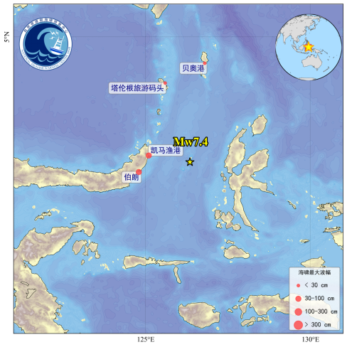 根据全球海啸监测数据,此次地震在震源附近引发了海啸。截至北京时间4月2日9时30分,凯马渔港站(1.4°N,125.1°E)监测到65厘米的海啸波;贝奥港站(4.2°N,126.8°E)监测到15厘米的海啸波;塔伦根旅游码头站(3.6°N,125.6°E)监测到13厘米的海啸波;伯朗站(0.9°N,124.8°E)监测到50厘米的海啸波。