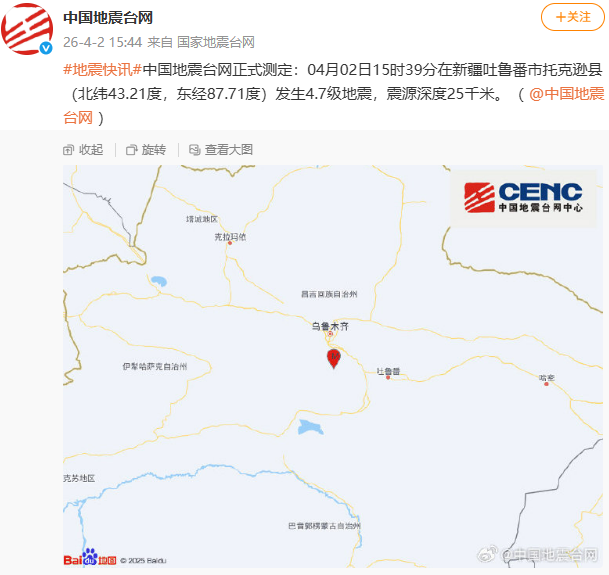 新疆吐鲁番市托克逊县发生4.7级地震,震源深度25千米