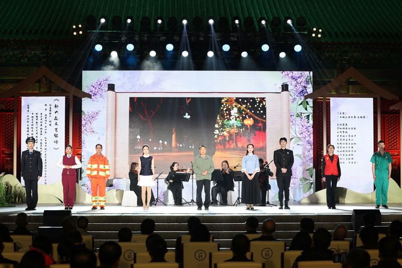 4月2日,西城区2026“百年丁香诗会”系列文化活动在报国寺内启幕,本届“百年丁香诗会”以“丁香为信、青春如诗”为主题,同时将举办诗歌沙龙、笔会、朗诵会、诗乐会、CityWalk+飞花令、丁香写诗屋等十余场特色活动。图为外卖骑手、银行职员、民警、医护人员等各行各业的青年代表登台表演,以 “诗人” 之姿展现青春风采。