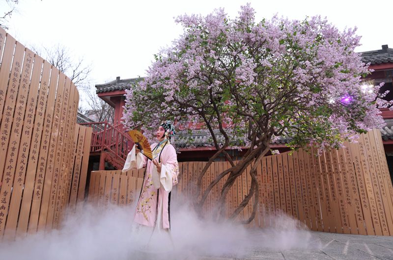 戏曲演员在丁香树下婉转演绎昆曲。活动主办方表示,本届诗会旨在完成从“以花聚友”的文人雅集,向“以文润城”的公共文化实践的转变。