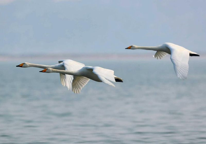 大天鹅在库区上空飞翔。