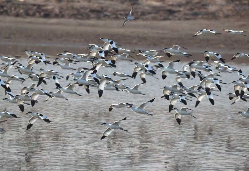 4月2日,北京黑豹野生动物保护站队员们在官厅水库观测到,库区候鸟大幅减少。除了二三百只反嘴鹬、凤头麦鸡及50余只天鹅外,其他鸟类已经陆续飞离。今年春季,队员累计监测到8万多只候鸟经停此地,迁徙季高峰期已进入尾声,预计本月底迁徙季结束。图为官厅水库库区的反嘴鹬。