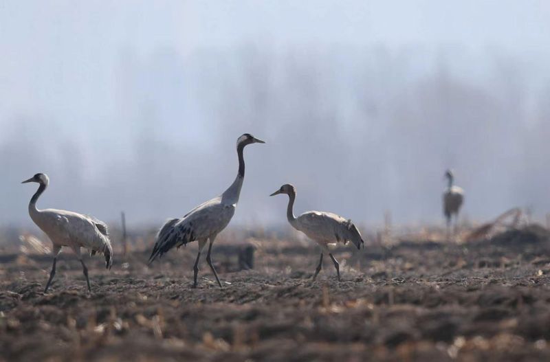 小灰鹤与大灰鹤合群后,陆续飞离库区。