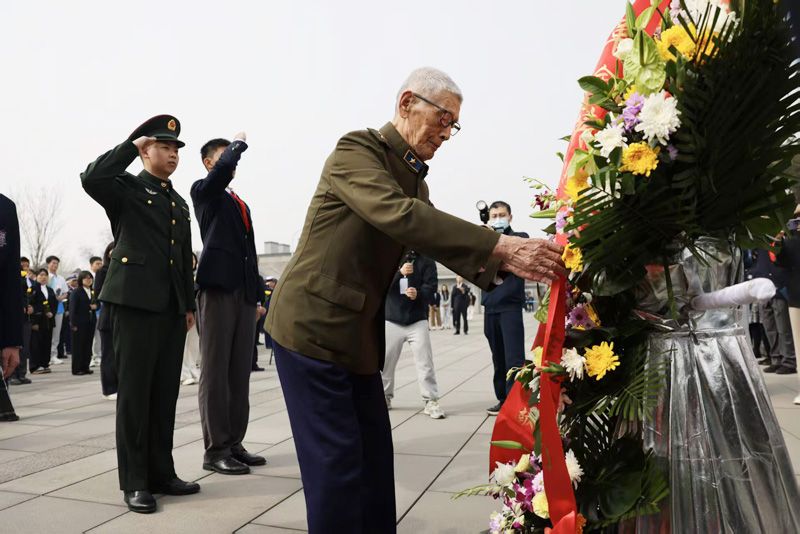 97岁的抗战老战士代表储渭与学生代表一同在独立自由勋章雕塑前向英烈敬献花篮。