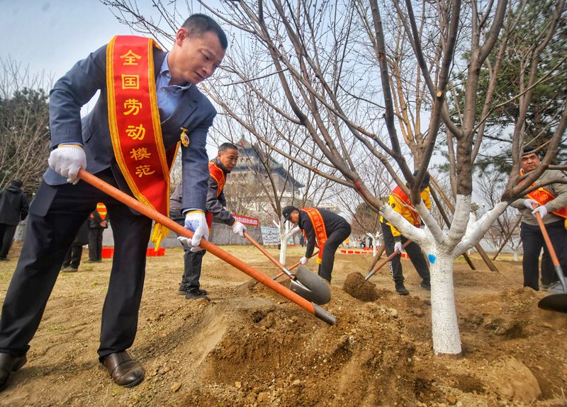 箭楼东侧绿地,全国劳动模范代表一起为树木填土。本次植树活动的前门月亮湾绿地,是东城区花园城市建设的重点项目,地处北京中轴线重要辐射区,位于正阳门“两门、三桥、五牌楼”的历史空间格局范围内。未来,这里将打造成总面积约7300平方米的公共绿化空间。