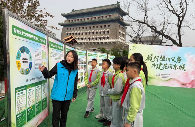 前门月亮湾绿地,工作人员为小同学讲解首都全民义务植树尽责形式。