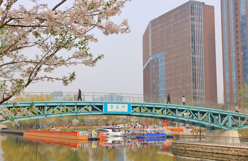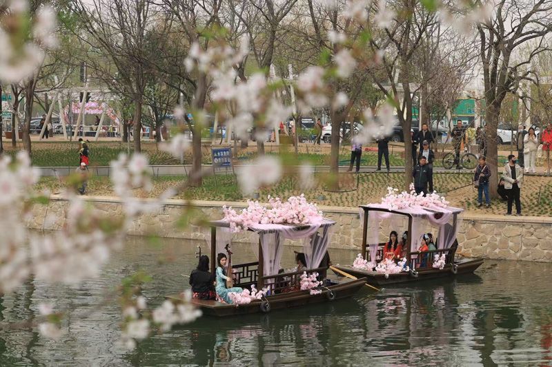游客泛舟河上,体验“船在花中行,人在画中游”的意境。据了解,北小河不同河段设置不同特色船型,东湖湾码头段配备摇橹船,北湖船闸至东湖船闸区域配备汽车船,东湖船闸东侧段配备观光船。
