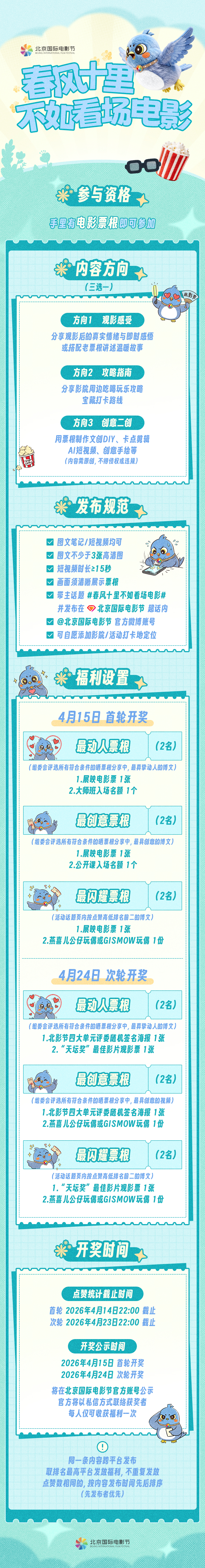 每一张票根都是通往电影世界的入场券。分享你的光影心声,不只是为了赢取奖品,更是为了留存这个春天最动人心弦的瞬间。这个春天,让我们在北京国际电影节相逢,一同续写那段未完待续的光影缘分。