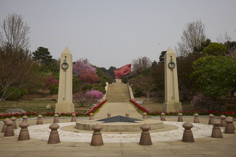八宝山革命公墓烈士纪念园,纪念碑与红旗雕塑庄严肃穆。