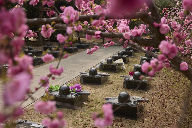 繁花灼灼,烈士墓碑静穆其中。