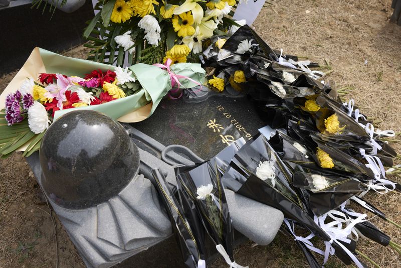 烈士墓碑前摆满敬献的鲜花。